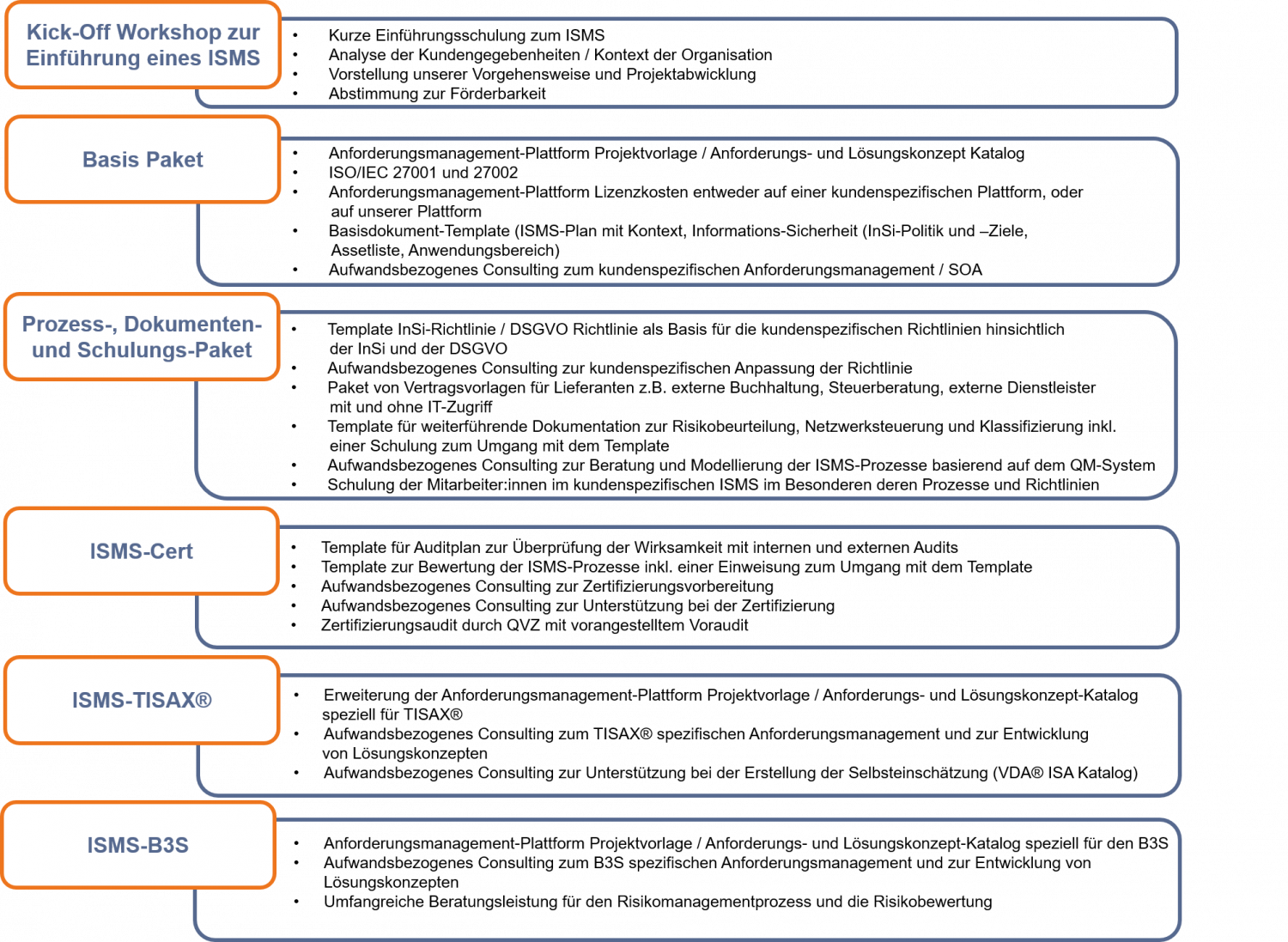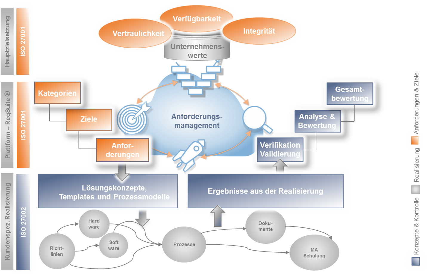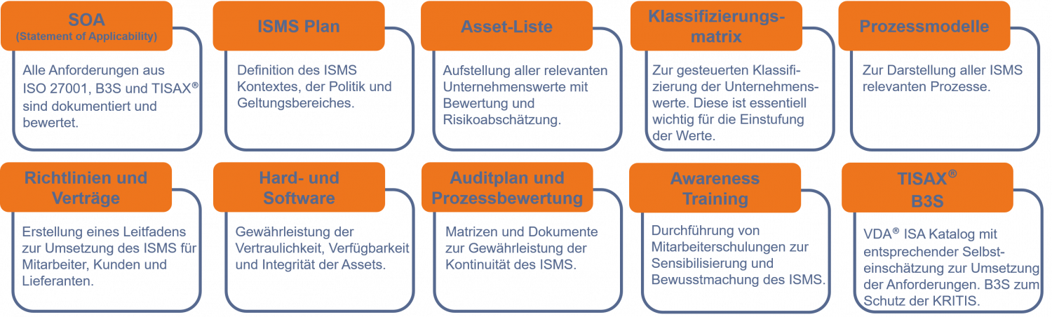 Die kundenspezifische Realisierung kann auf Basis von vorgefertigten und anforderungsorientierten Lösungskonzepten gemäß ISO/IEC 27002 Prozessen und Templates entwickelt und umgesetzt werden.