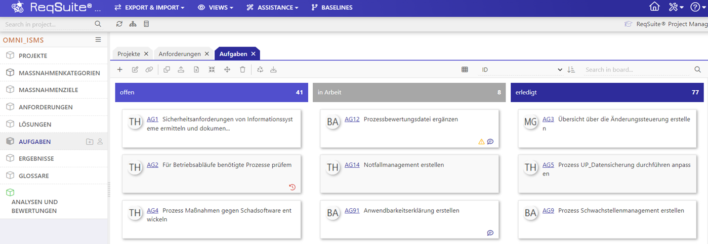 Zur Unterstützung des Projektmanagements können Aufgaben zu Anforderungen, Lösungskonzepten und Ergebnissen personenspezifisch innerhalb der Plattform vergeben und organisiert werden.